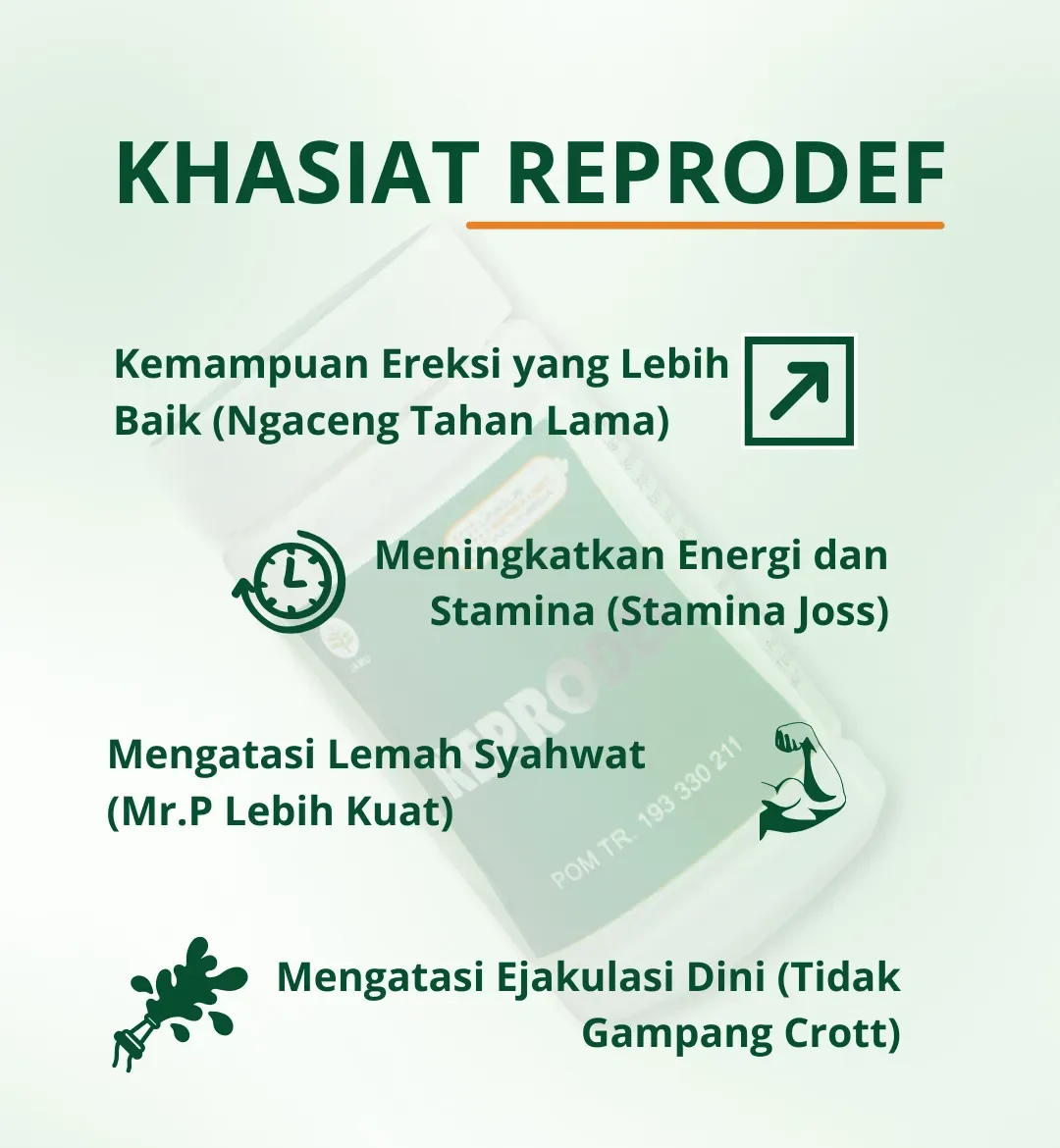 REPRODEF adalah obat kuat herbal yang terbuat dari bahan pilihan alami dengan jaminan mutu terbaik sehingga memiliki khasiat MAKSIMAL, KUAT, & TAHAN LAMA tanpa perlu khawatir dengan efek samping.